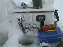 | 1月22日 | 本日は告知道理、赤城大沼に登頂してきました。 朝6:00に到着です、かなり賑わってます。しかし、雪がかなりあります、 って言うか物凄い風が吹いていて雪が横殴りです。 道路もかなり積雪がありますので、注意が必要!! 朝方にも関わらず除雪しております。 帰りには、もう少しで雪道も終わりというところで、車が1台転んでました。 運転手の姿は見えませんでしたが、無事である事を祈ります。 リンク側に入ろうと、今日はグリーン荘で道具を借ります。 久々のブリザード、右の写真を見てもらうとわかりますが、 釣り終わりには雪で軽く埋まっていました。 さて本日の釣果ですが、悲しいかな0匹です。 毎度の事ながら、非常に厳しい釣果です。 (電動リールが穂先改造されました。) この無念は来週はらすぞ!! 赤城大沼基本情報 釣り券 700円 釣りテント 1人用 1500円 2人用 2500円 穴あけドリル 1時間 1000円 氷すくい網 100円 |